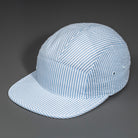 A Classic Seer Sucker, Blank 5 Panel Camp Hat With Flat Bill, & Premium Leather Strapback.